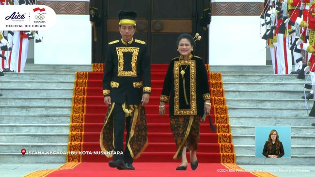 Ia didampingi ibu negara Iriana Joko Widodo yang juga menggunakan pakaian yang sama. Iriana mengenakan rok hitam dibalut kain batik.