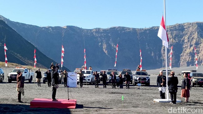 Upacara HUT ke-79 Republik Indonesia digelar di berbagai penjuru Indonesia. Salah satunya di lautan pasir Gunung Bromo yang menjadi tempat upacara nan syahdu.