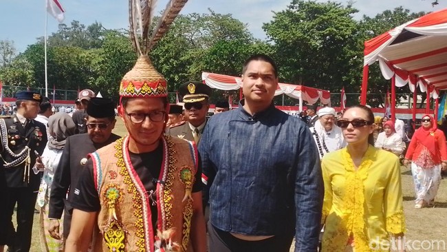 Sandiaga Uno datang dengan menggunakan baju adat Kalimantan Timur yang didapatnya ketika berada Kabupaten Berau. Kesempatan Upacara Hari Kemerdekaan Republik Indonesia ke-79 ini menurutnya sebagai representasi dari dukungan pemerintah kepada wilayah 3T (tertinggal, terluar, terdepan).