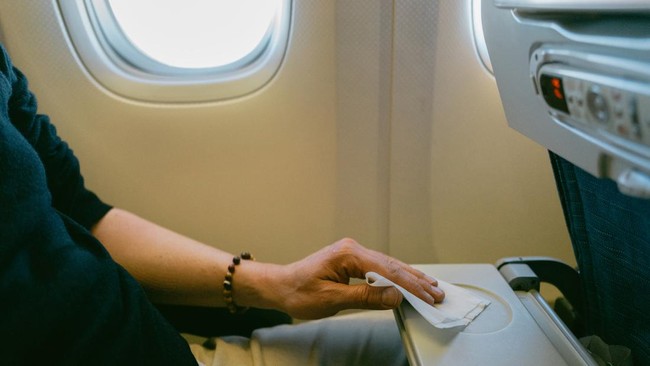 Dan, satu tempat yang menjadi sarang kuman adalah meja lipat di kursi pesawat. Tisu basah bisa dipakai untuk mengelap permukaan meja lipat dan permukaan lain yang dinilai kotor.