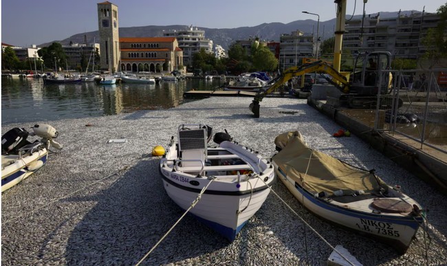 Yunani menghadapi bencana lingkungan akibat cuaca ekstrem, dengan ratusan ribu bangkai ikan di pelabuhan Volos. Bau busuk menyebar hingga beberapa kilometer.