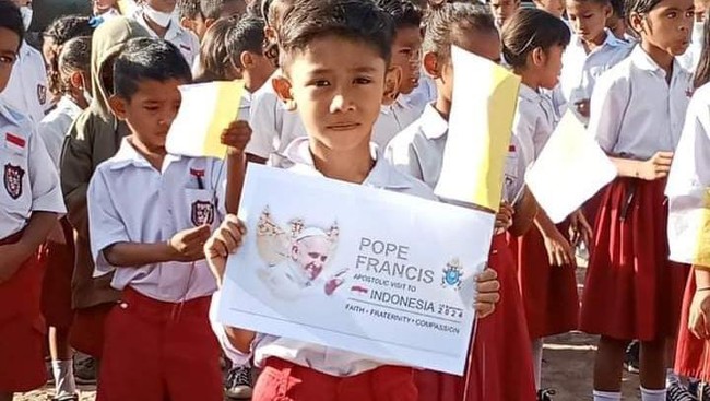 Paus Fransiskus tiba di Jakarta. Ratusan anak SD dan guru-guru di Flores Timur turut menyambutnya. Mereka menyerukan: Viva Papa Fransesco.
