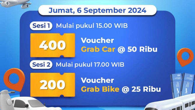 Khusus di hari pertama, Jumat (6/9) hadiahnya berupa 600 voucher Grab yang terdiri dari 400 voucher GrabCar senilai Rp 50.000 dan 200 voucher GrabBike senilai masing-masing Rp 25.000. Semuanya gratis untuk traveler!