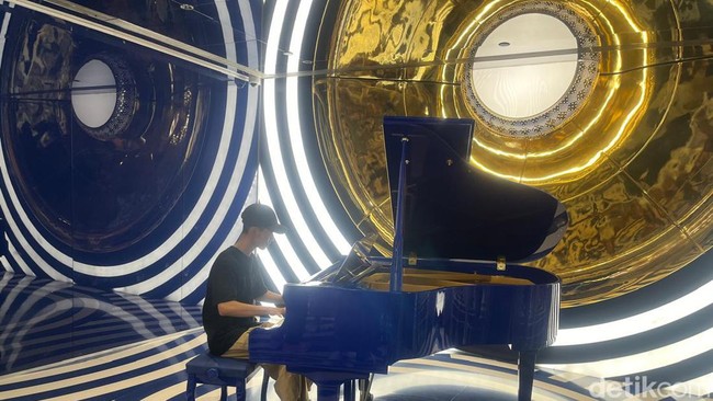 Tema toilet di lantai 5 juga tak kalah menarik. Di sini, pengunjung justru seolah diajak memasuki tempat nongkrong kekinian, meja dengan kursinya disertai colokan, cermin, dan bentuk serba lingkaran. Di ujung lorong bulat terdapat piano.