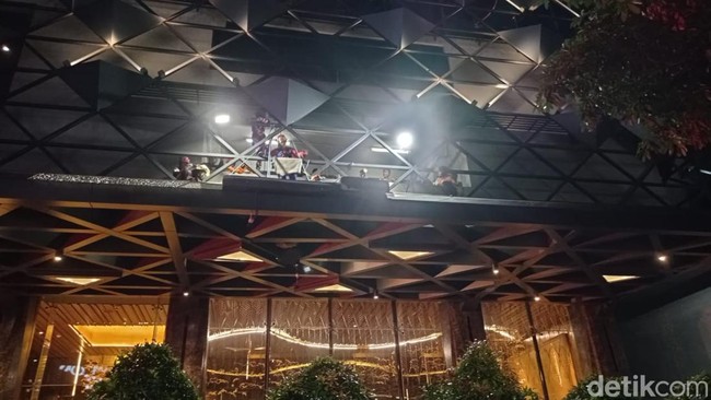 Petugas tampak memakai peralatan lengkap dari damkar dan berusaha menurunkan tubuh jenazah. Jenazah pria itu tampak tersangkut di bagian kanopi hotel.