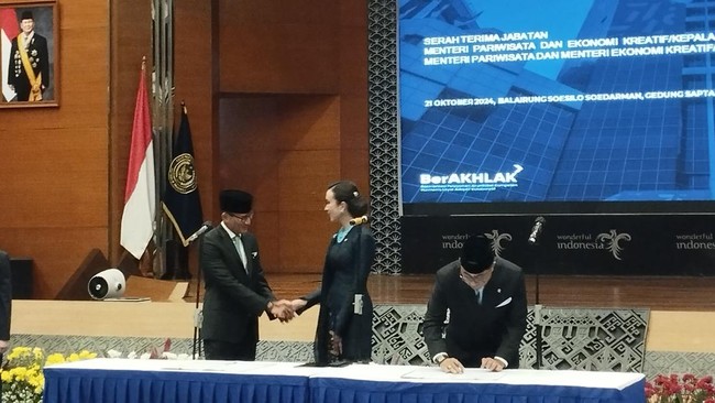 Ucapan itu disampaikan Sandiaga dalam acara Serah Terima Jabatan Menparekraf kepada dua menteri baru yang menggantikannya sekaligus, Menteri Pariwisata dan Menteri Ekonomi Kreatif, di Balairung Soesilo Soedarman, Gedung Sapta Pesona Jakarta, Senin (21/10/2024).