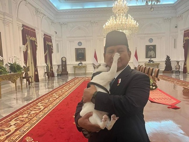 Presiden Prabowo membagikan momen lucunya bersama kucing kesayangan, Bobby Kertanegara di laman Instagramnya. Terlihat kucing gembul itu menggigit manja pipi Prabowo.