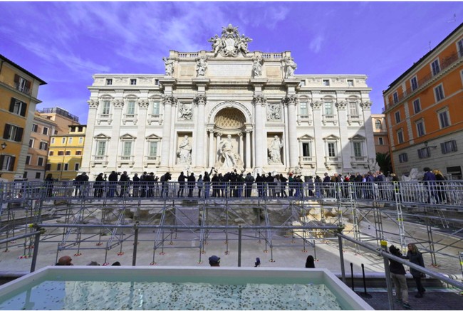 Trevi Fountain sedang dalam perawatan sehingga air kolam dikuras. Untuk membuat situs tetap menarik, ada jembatan gantung yang disediakan untuk turis.
