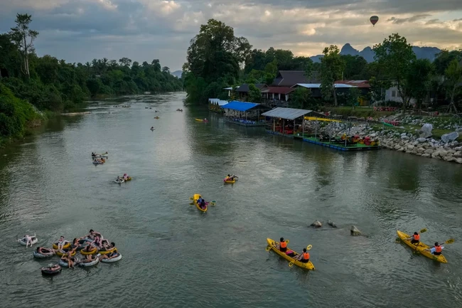 Vang Vieng dan daerah pegunungan di sekitarnya menjadi pusat kegiatan luar ruangan, termasuk kayak, jelajah hutan, parasailing, tubing, dan panjat tebing.