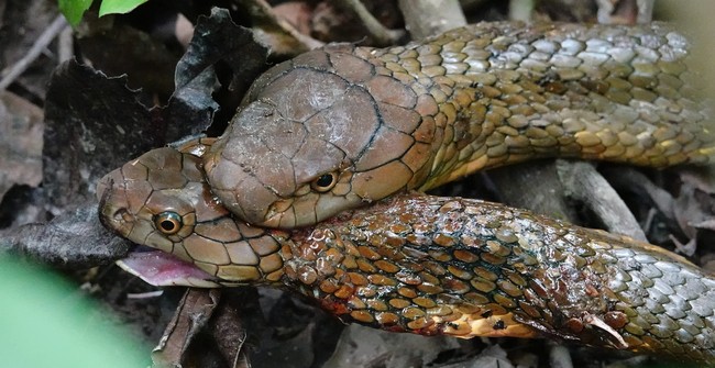 Sebuah pertemuan yang sangat langka, kanibalisme pada ular king kobra didokumentasikan dalam foto. Momen itu mungkin pertama kalinya terjadi di Singapura pada awal tahun ini.