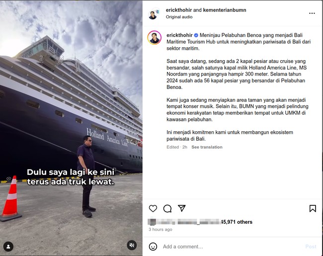 "Saat saya datang, sedang ada 2 kapal pesiar atau cruise yang bersandar, salah satunya kapal milik Holland America Line, MS Noordam yang panjangnya hampir 300 meter," tulisnya dalam caption.