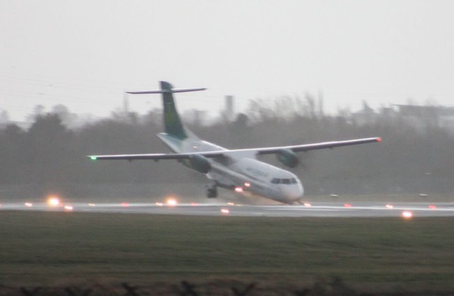Pesawat yang dioperasikan maskapai Aer Lingus mendarat kasar di Bandara Kota Belfast, Irlandia Utara, Minggu (22/12). Pesawat mendarat darurat saat angin kencang hingga menghantam landasan.