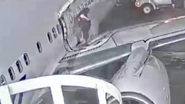 Rekaman video menunjukkan penumpang yang memakai kemeja merah dan celana gelap tengah berjalan dengan membawa tas ranselnya ke tepi sayap dekat jendela. Ia menunduk lalu melambaikan tangan dengan maksud mungkin memanggil petugas lain.