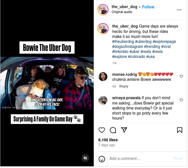 Kini, Bowie, yang juga disapa 'The Uber Dog' memiliki ratusan ribu pengikut di media sosial. Para pengikutnya selalu antusias dengan video terbaru dia bertemu para penumpang.