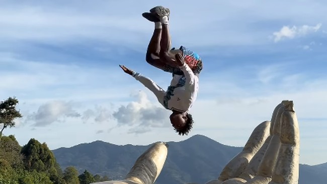 Dia melakukan backflip di sebuah sculpture yang dijuluki sebagai tangan Tuhan, spot berbentuk tangan raksasa, yang menjorok ke jurang.