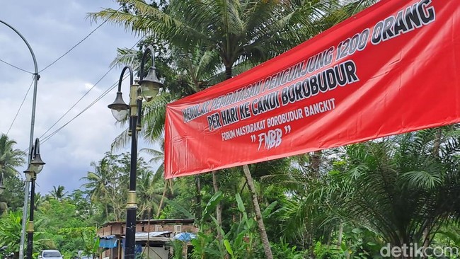 Muncul spanduk berisi protes terhadap kebijakan pembatasan wisatawan yang mau naik ke candi Borobudur. Spanduk itu bermunculan di sekitar candi.