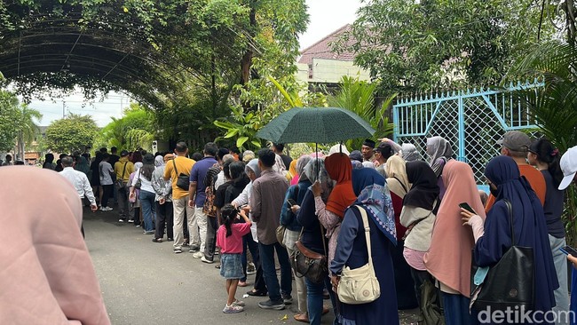 Dari pantauan detikJateng, warga rela antre memanjang hingga 50 meter. Bahkan, warga yang datang ada yang membawa payung di tengah terik matahari.