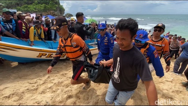 Sebanyak 13 pelajar asal Mojokerto, Jawa Timur, terseret rip current atau arus air yang mengalir kuat ke arah laut saat bermain air di Pantai Drini, Gunungkidul, Selasa (28/1). Dari belasan pelajar, 9 orang berhasil diselamatkan, 3 meninggal dunia, dan satu masih dalam pencarian.