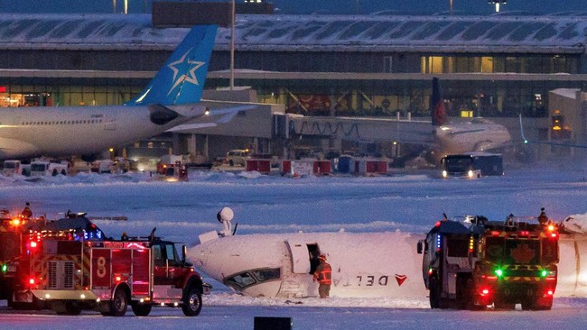 Sebuah pesawat Delta Air Lines mengalami kecelakaan saat mendarat di Bandara Internasional Toronto Pearson (YYZ), Kanada, Senin (17/2/2025). Berikut kronologi kecelakaan tunggal hingga pesawat terbalik.