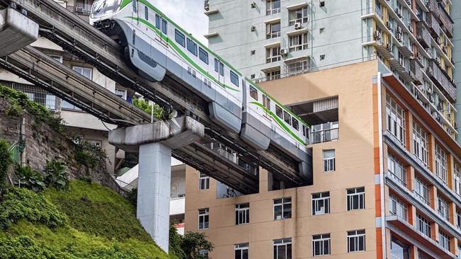 Pernah membayangkan kereta menerobos gedung apartemen? Bukan adegan film sci-fi, ini nyata terjadi di Chongqing, China. Monorel superunik itu baru saja dinobatkan sebagai salah satu dari tujuh sistem monorel paling mengesankan di dunia versi surat kabar Inggris, MailOnline.