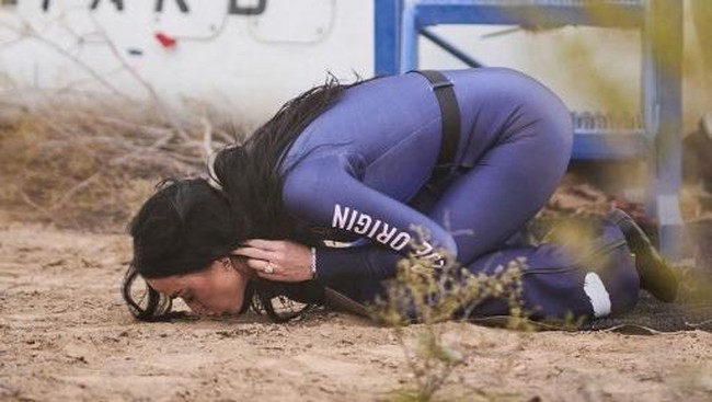 Penyanyi Amerika Serikat, Katy Perry, mencium tanah ketika berhasil mendarat dengan selamat di Bumi usai perjalanannya ke luar angkasa bersama Blue Origin dengan roket New Shepard pada Senin (14/4/2025) pagi waktu setempat. Perjalanan luar angkasa itu sendiri hanya