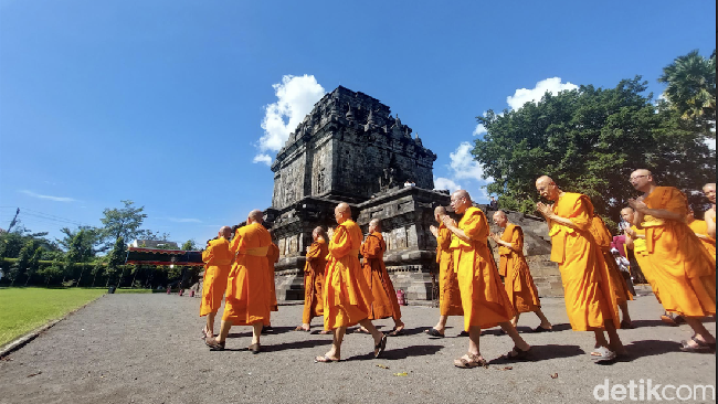 Pantauan detikcom di Candi Mendut, Senin (12/5/2025) keramaian telah terlihat sejak pagi di Candi Mendut, titik start kirab Waisak. Kirab itu menuju Candi Borobudur siang ini.