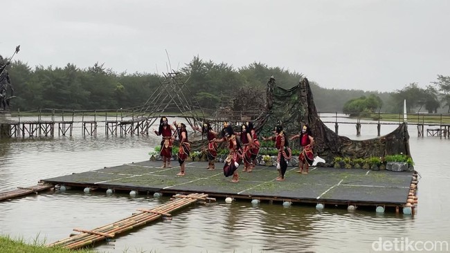 Para penari berlenggak-lenggok di atas panggung yang dibangun di tengah perairan Laguna Glagah dengan latar belakang instalasi seni patung.