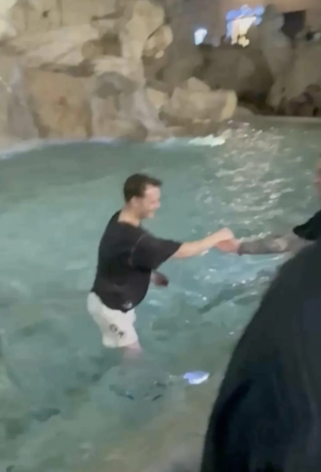 Dalam video tersebut, turis itu berdiri setinggi lutut di dalam air dengan kaus dan celana pendek yang basah kuyup. Seorang wisatawan lain membantunya dengan menariknya ke tepian dan keluar dari air mancur.