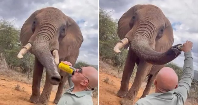 Pria yang tak disebutkan identitasnya itu merekam liburannya di Ol Jogi Conservancy di wilayah Laikipia bagian tengah, Kenya. Saat memberi makan dua gajah, ia tiba-tiba mengeluarkan sekaleng bir lokal.