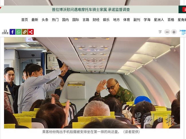 Saat mendengar tepuk tangan meriah dari penumpang di bagian belakang pesawat, Tharman pun dengan sopan berdiri, berbalik, dan melambaikan tangan.