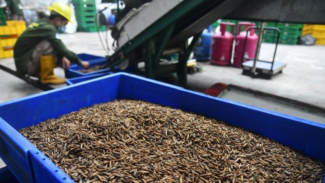 Proses Hilir, hasil biokonversi berupa larva BSF, yang mengandung 50% protein dan asam amino, sangat cocok sebagai pakan ternak.