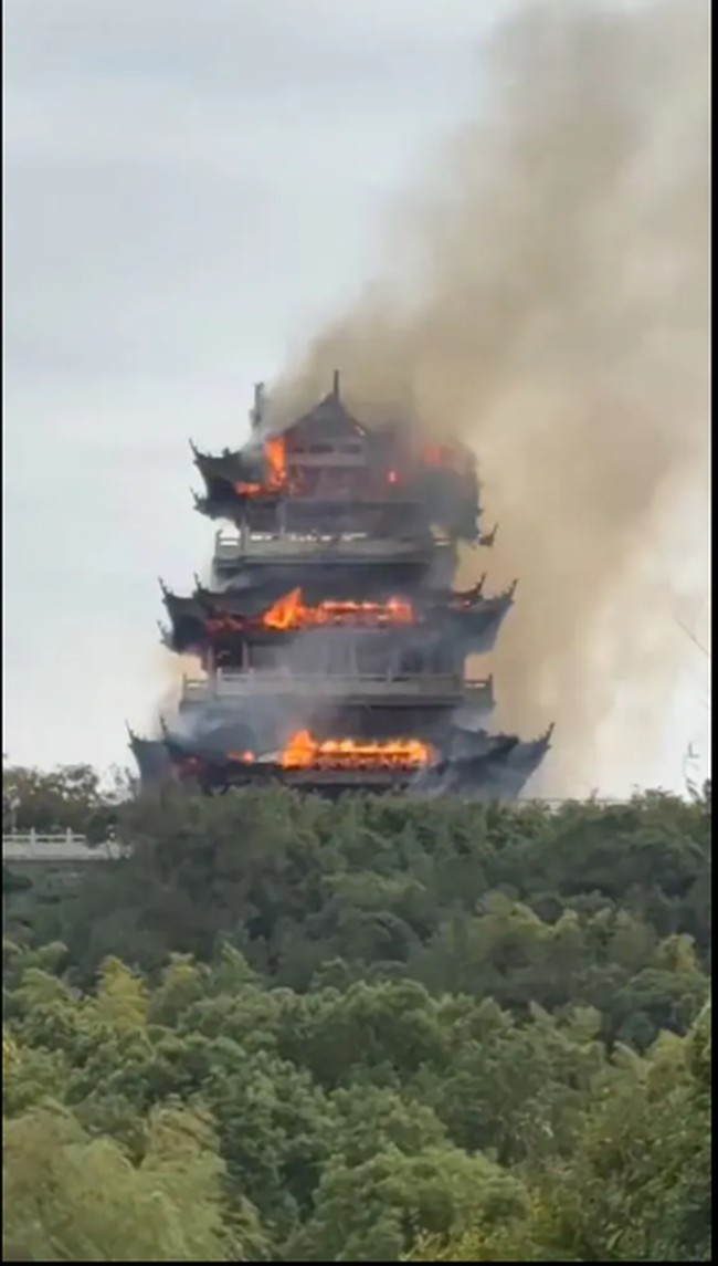 Viral di media sosial China, bangunan itu kemudian habis dilalap api. Asap hitam mengepul dari dalam bangunan kuil. Api dengan cepat dipadamkan agar tidak menyebar ke area hutan di sekitarnya.