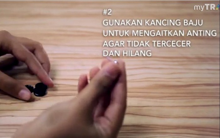 Anting. Ada cara khusus juga untuk packing anting yang akan Anda bawa saat traveling. Gunakan kancing baju sebagai pengait. Kaitkan anting tersebut dalam lubang yang ada di kancing. Ini digunakan agar anting tidak tercecer dan hilang.