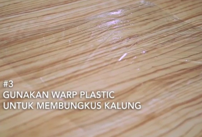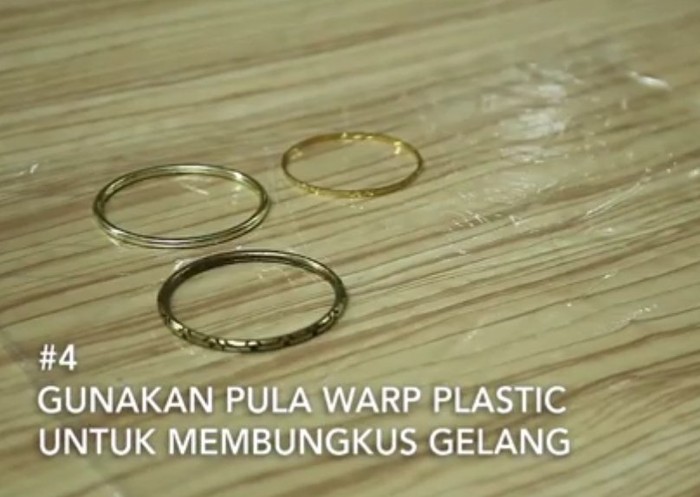 Warp plastik juga asyik digunakan untuk membungkus gelang. Pertama-tama susun gelang di atas warp plastik. Kemudian, lipat plastik. Ini juga ditujukan agak gelang tidak menumpuk sehingga sulit untuk diambil.